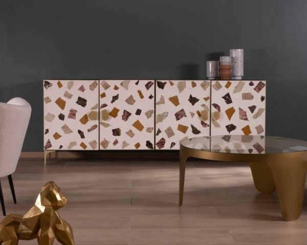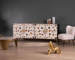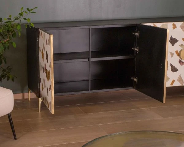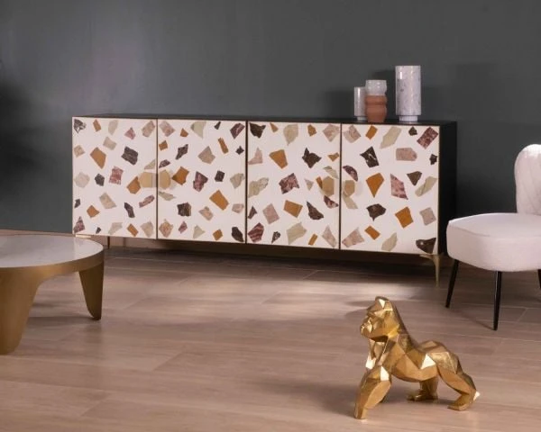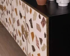Livré déjà assemblé, ce meuble tendance sera vite fait bien fait à votre disposition. Et si vous alliez chiner de beaux miroirs en laiton le temps qu’il arrive ? Vous pourriez créer une composition en pèle mêle au-dessus de son plateau supérieur noir. Si vous aimez les ambiances féminines et poudrées, n’hésitez pas à repeindre le mur devant lequel il sera installé dans une des teintes du terrazzo. Des peintures mates ou satinées donneront une ambiance douce et chaleureuse à la fois à votre intérieur et si vous installez quelques bougies parfumées sur votre bahut métal alors là… les soirées vont être douces !