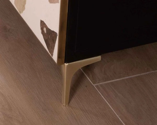 Chez Meuble House nous avons littéralement craquée pour le jeu de couleurs et de contrastes apportés par le mélange des matériaux et vous ? Et avez-vous remarquez la forme atypique des poignées ? Elles reprennent le motif des portes et s’harmonisent au doré des pieds. Trop fort !