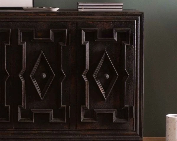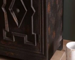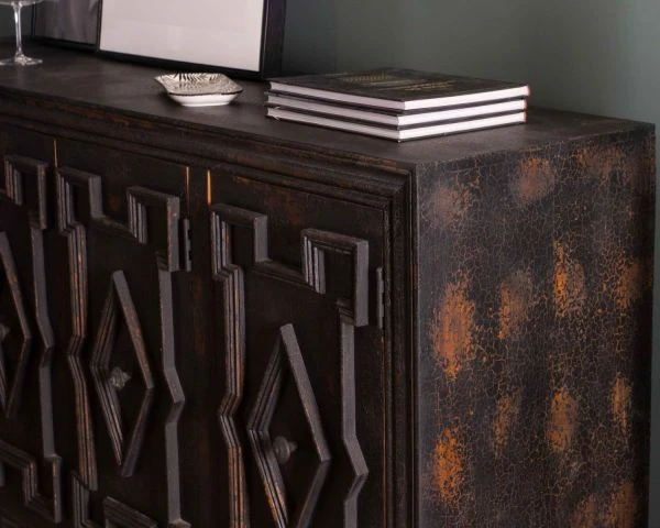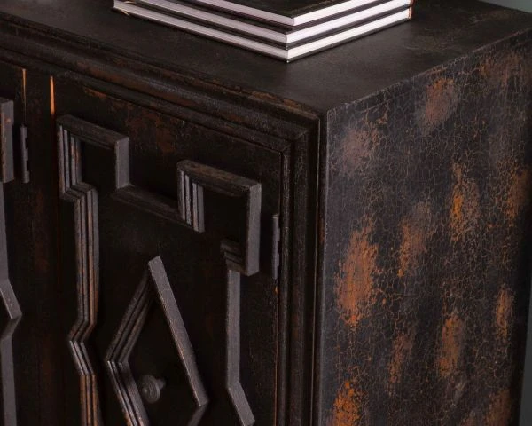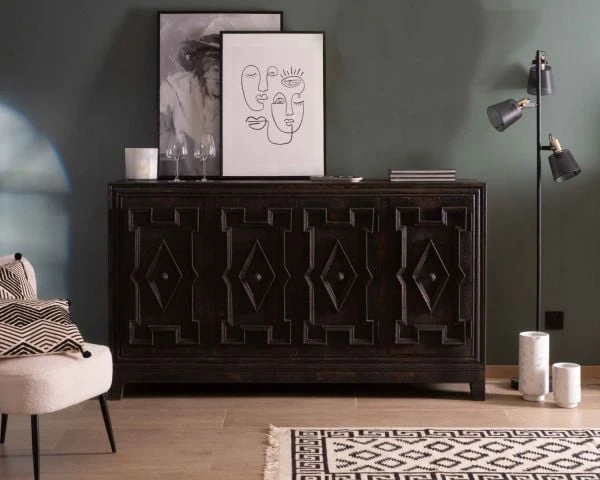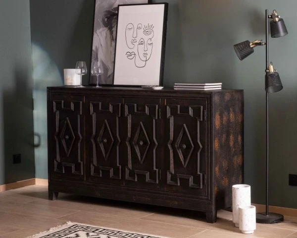Le bahut en bois exotique portes sculptées « Batti » avec son style ethnique et son aspect vintage craquelé a ce je ne sais quoi qui ne laisse personne indifférent. Entre sa peinture texturée, ses motifs géométriques en façade rappelant des motifs africains ou aztèques et son aspect faussement vieilli, ce meuble de rangement charmera tous les amoureux du style traditionnel et des meubles d’antan. Cette enfilade en bois massif de 98 cm de haut profite aussi de petits détails qui apporteront encore plus de cachet. On pense principalement aux pieds évasés, aux poignées rondes montées au centre de chaque porte…