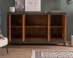 Question rangement, ce buffet en bois exotique offre de beaux modules de stockage. Au centre les deux portes s’ouvrent sur deux caissons non divisés par un montant central qui vous empêcherait de ranger de grands plateaux par exemple. L’ergonomie est optimisée et vous pouvez organiser vos affaires sans difficulté. De chaque côté du buffet, deux autres portes renferment une niche séparée par une solide étagère bois. Avez-vous aussi remarqué comment la teinte du bois chaleureuse à l’intérieur du meuble contraste avec l’extérieur ? Trop canon !