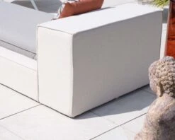 La structure, habillée de tissu à la fraîche teinte blanc cassé, a été conçue tel un meuble d’intérieur avec sa tête de lit et son cadre matelassés qui enveloppent le confortable matelas tel un nid douillet et font de ce futon un véritable lit de terrasse. Que ce soit pour vous adosser le temps d’une lecture, d’une discussion ou simplement profiter d’une position semi-assise pour admirer le paysage, le dossier vous offrira son soutien moelleux.