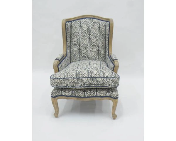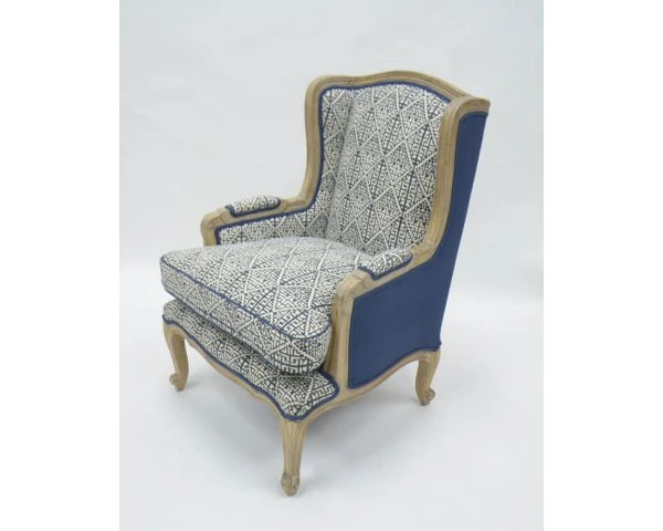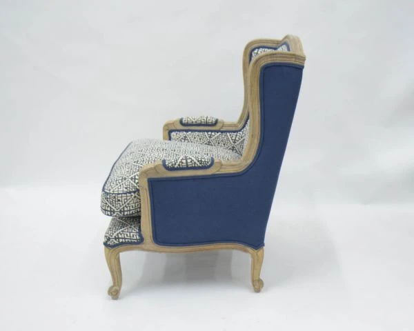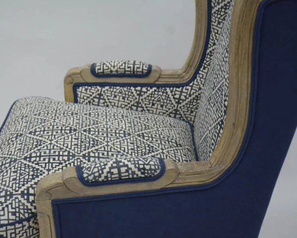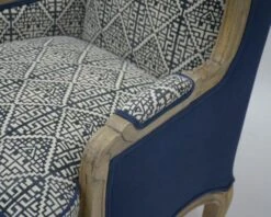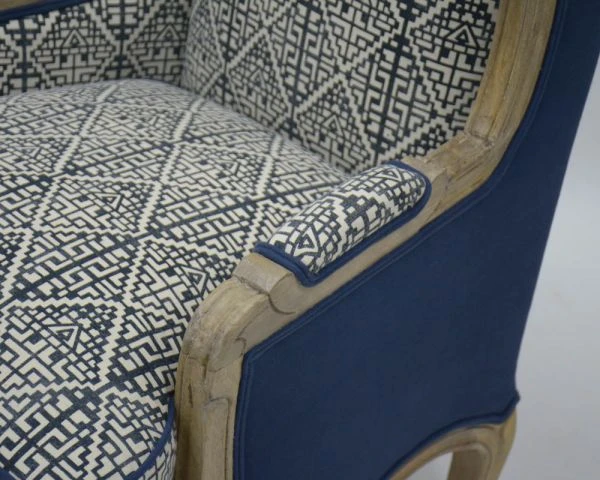 Le fauteuil bergère dispose depuis toujours d’une allure traditionnelle des plus élégantes. Aujourd’hui, les designers le modernisent par des motifs contemporains comme avec ce superbe dessin aztèque blanc et bleu.