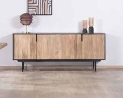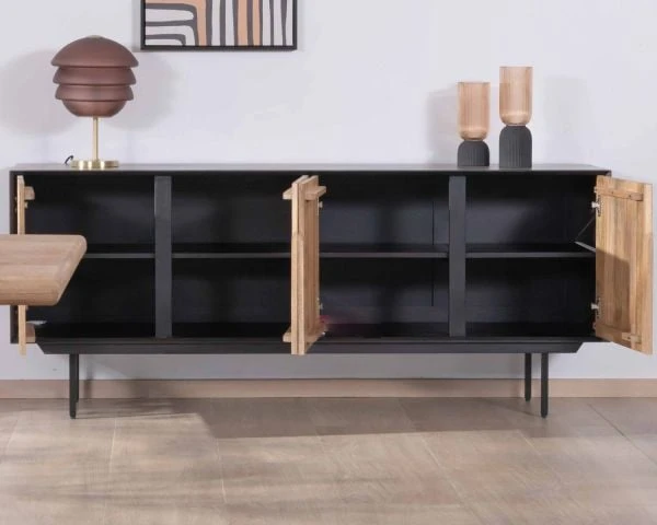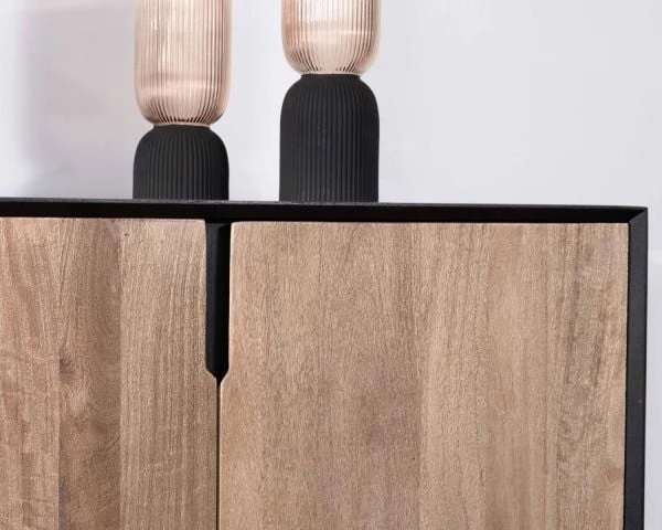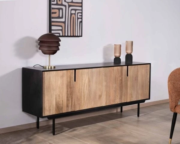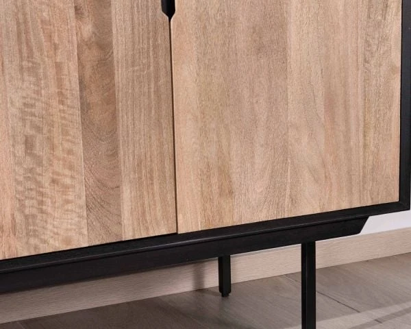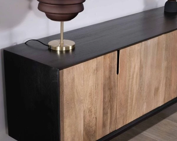 La structure en manguier massif de cet élégant buffet de 183 cm de long est peinte en noir et sert de toile de fond pour mettre en valeur la beauté des quatre portes à la teinte naturelle et à la finition sablée. Dans cette configuration, le veinage ondoyant et nuancé de cette essence exotique est superbement mis en valeur et ponctuera votre séjour d’une touche chaleureuse et design à la fois.