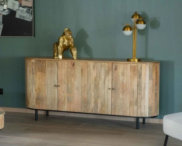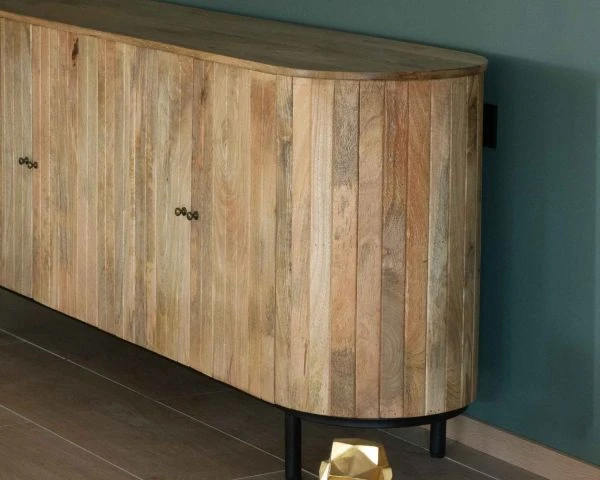 Entre ses poignées boutons, ses pieds cylindriques en métal noir et la teinte miel pleine de nuances du bois massif de manguier, l’enfilade post vintage sera sublimée par des murs aussi bien clairs que colorés. Le vert mat kaki pourra très bien lui convenir par exemple. Sur le plateau pourquoi ne pas disposer à chaque extrémité deux lampes avec abat-jours noirs ? Au centre du mur un élégant miroir géométrique au cadre doré sera parfait.
