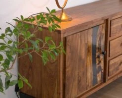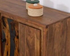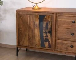 Assurément les façades des portes contribuent au caractère incroyablement enjôleur de ce bahut en acacia, métal et résine qu’on imagine de manière assez intuitive dans un décor colonial mais qui s’adaptera parfaitement dans des intérieurs de style ethnique. Dans une atmosphère plus contemporaine il apportera une note exotique et raffinée grâce à la nature vivante du bois d’acacia et son décor fossilisé.