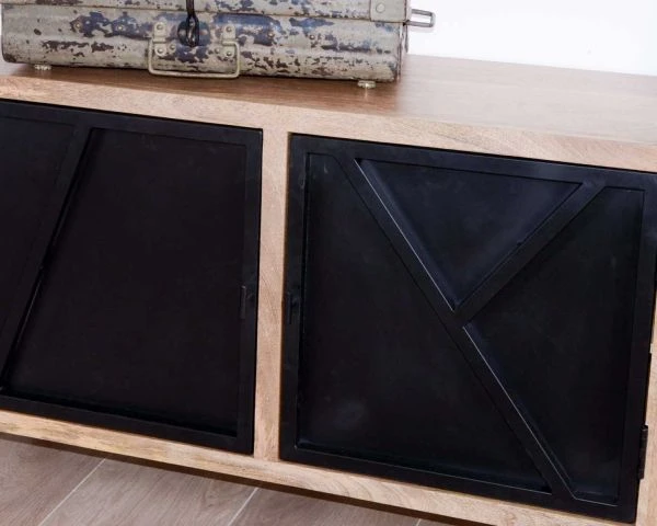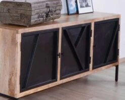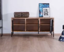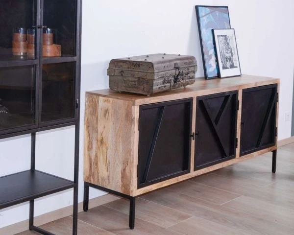 Avec des dimensions de 180 x 45 x 80 cm (longueur x profondeur x hauteur), ce buffet bois et métal trouve aussi bien sa place dans la cuisine, le salon, le bureau, la salle à manger. Dans une loggia, il permet de stocker la vaisselle de famille, dans votre espace travail vos dossiers y seront parfaitement à l’abri. Sur le haut du caisson, les vases, cadres photos et autres objets déco trôneront avec fière allure. De quoi joindre l’utile à l’agréable !
