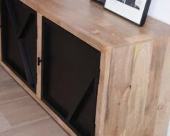Le buffet « Pierre » en manguier massif et métal noir conjugue avec talent la fonctionnalité d’un meuble de rangement à un design sobre et efficace sans fioritures. Avec sa poignée minimaliste, chaque porte est une sorte de tableau contemporain qui met en valeur votre décoration.