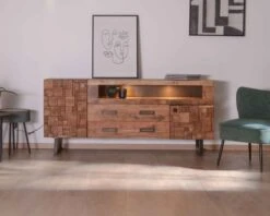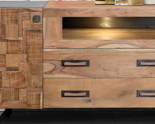 Très esthétique et original, notre buffet bas en acacia sera sans nul doute une pièce maîtresse de la décoration de votre intérieur. A la fois pratique grâce à sa capacité de rangement et esthétique, il saura attirer le regard de vos invités. Apportez-y une touche finale en déposant sur son beau plateau bi-matière de beaux objets décoratifs comme un vase en verre soufflé. Le bois de ce meuble est travaillé de manières différentes. En effet, les portes des deux placards sont texturées façon « damier en bois », alors que les façades des tiroirs et l’encadrement de l’étagère sont parfaitement lisses. Cet harmonieux contraste renforce la personnalité de ce buffet tout comme ses côtés teintés foncés et une partie du plateau supérieur.