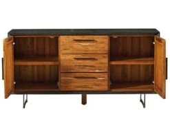Avec ses formes élégantes et sobres, son bois de bateau recyclé, son bois waru teinté noir et le métal de ses pieds, ce buffet donnera du caractère à votre séjour. Ses nombreux espaces de rangement vous permettront également de garder un intérieur dégagé.