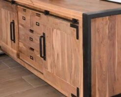 Profitez dans votre cuisine, dans votre séjour ou dans votre salle à manger de ce buffet de style indus’ de belles dimensions. Avec sa longueur de 190 cm, sa hauteur de 80 cm et sa profondeur de 50 cm, le buffet métal et bois « Montréal » vous permet d’animer votre espace de vie tout en le maintenant parfaitement rangé. Derrière ses portes coulissantes montées sur rails métal et bois, vous retrouverez quatres compartiments. Livres, DVDs, jeux de société, linge de maison, vaisselle… toutes vos affaires seront idéalement stockées à l’abri du passage et de la poussière. Deux petits et deux grands tiroirs à poignées découpées recevront quant à eux couverts, dossiers administratifs et autres babioles. Tout est à portée de main, tout est rangé, tout est optimisé. Même le ménage sera facilité grâce au caisson surélevé. Que demandez de mieux ?