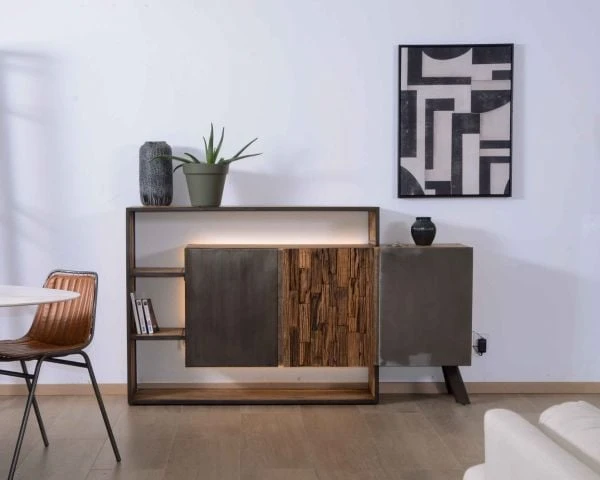 Rangez votre vaisselle ou votre linge de maison derrière les 3 portes aux façades uniques. La feuille de métal, le bois recyclé et le placage de ciment texturé s’unissent pour un résultat incroyable. Conjugués au travail de soudure du fer entourant la structure en manguier massif, ces matériaux apportent beaucoup de modernité à l’ensemble de ce bahut hors du commun.
