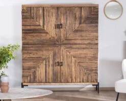 La façade de ce buffet est composée de quatre portes intégrées dans un motif géométrique où les jeux de textures et de nuances forment un tableau captivant. Quatre grands triangles en chevrons dessinent les diagonales, masquant le contour des portes, tandis que les finitions brutes favorisent le jeu de la lumière pour exacerber les teintes riches, chaleureuses et variées du bois d’acacia.