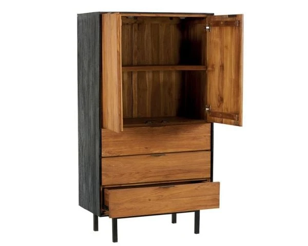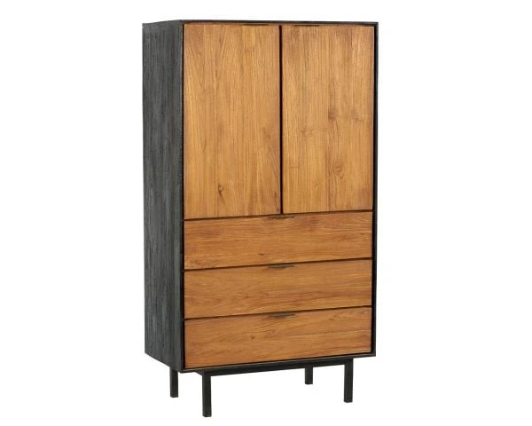 Ce joli buffet 2 portes 3 tiroirs « Alberden » ne se contente pas d’être fonctionnel, il a également été pensé pour être esthétique afin de venir sublimer un salon ou une entrée. On aime le duo des teintes, entre le bois de teck exotique brut et teinté noir ainsi que les pieds en métal. Grâce à ses lignes très épurées et à sa sobriété, ce buffet haut apportera à coup sûr une touche d’élégance et de raffinement à votre séjour ou pourquoi pas à votre chambre.