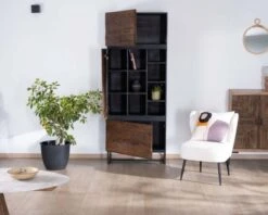 La partie centrale du meuble est divisée en trois partie dans le sens vertical : un compartiment fermé par une porte pleine et divisé en trois niches et deux colonnes de 3 et 4 niches ouvertes dont la couleur noire cultive une part de mystère sur son contenu, tout en proposant une toile de fond idéale pour mettre en valeur des objets décoratifs en métal ou colorés.