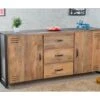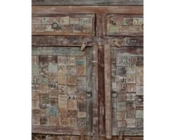 Avec des dimensions de 150 x 40 x 90 cm (longueur x profondeur x hauteur), ce bahut indien est une pièce authentique, 100% unique. Les façades de ses 3 tiroirs et de ses 3 portes sont ornées de petites poignées en métal rondes mais surtout de détails gravés délicieusement ouvragés. Ces détails ont été upcyclés à partir de frises indiennes et de bois colorés récupérés dans d’anciennes maisons indiennes désertées et abandonnées du Rajasthan.