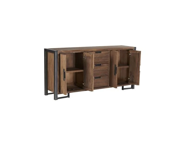 Ce buffet industriel est composé de 2 doubles portes et de 3 tiroirs. Derrière chaque porte, vous retrouverez une étagère qui vous permettra de ranger votre vaisselle par exemple.