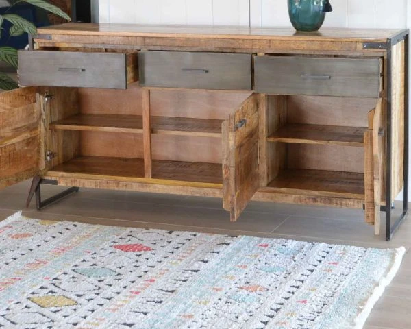 Dans ses différents rangements, vous pourrez organiser facilement vos affaires. Dans votre véranda aménagée, ce meuble de 170 cm de long vous permettra de stocker la vaisselle destinée aux repas du dimanche tandis que dans une cuisine, vous pourrez bien organiser vos serviettes et torchons, vos petits appareils ménagers ou votre épicerie sèche pourquoi pas. Les enfants adoreront prendre un gâteau ou un bonbon accompagné d’un fruit disposé dans une coupe placé sur le plateau en bois. Dans votre salle à manger, vous disposerez fièrement sur le plateau supérieur des cadres photos, une lampe à poser ou des plantes vertes pour créer une ambiance raffinée mais décontractée.