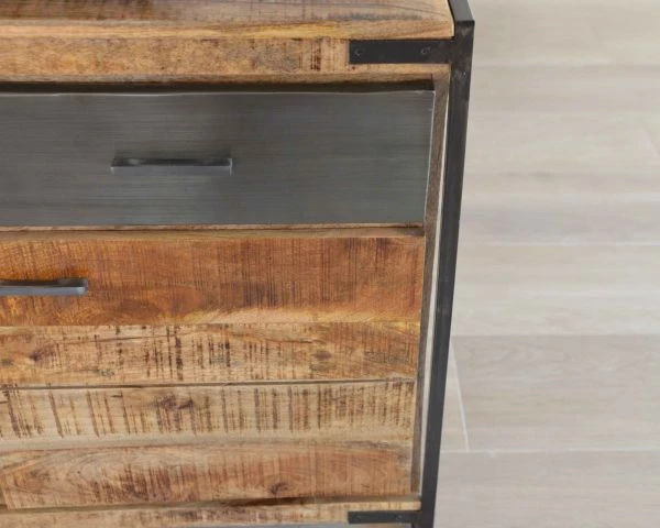 Ce buffet bas de la collection « Shade » assume pleinement son design factory. Et oui, le style industriel séduit encore et toujours… Réalisé à partir de métal, de MDF et de bois de manguier massif, il affiche un cachet dont vous ne vous lasserez pas. Doté de pieds géométriques originaux qui soutiennent le caisson de façon efficace, le buffet 3 portes 3 tiroirs « Shade » a de l’allure ! On adore ses détails, son bois nuancé et son travail de soudure brut apparent qui apporte encore plus de cachet.