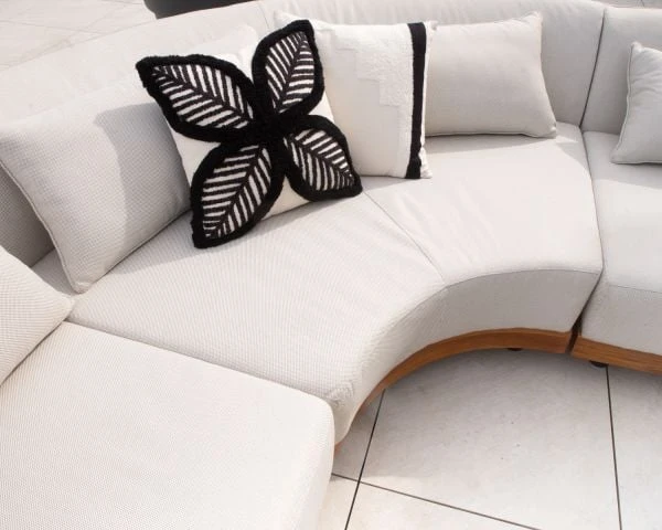 Ce spacieux canapé d’angle vous attire sur ses moelleux coussins au doux coloris écru chiné pour profiter d’une ambiance idyllique et chic sur votre terrasse de style contemporain. Grâce à son design ample et aéré, son assise bénéficie d’une délicate courbure pour accueillir 6 à 8 personnes sans perdre de place dans l’angle, exploitant ainsi un espace souvent inutilisé dans les modèles classiques.
