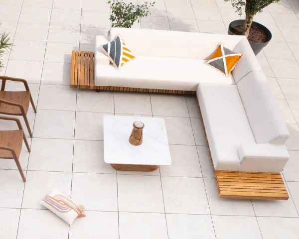 Le contraste du tissu clair avec la teinte chaude du bois inspire une ambiance estivale raffinée et conviviale dotée d’une touche de fraîcheur. Installé seul, à 2, à 6 ou plus, chacun trouvera une place confortable sur ce canapé aux dimensions généreuses de 3m x 3m et son assise profonde.
