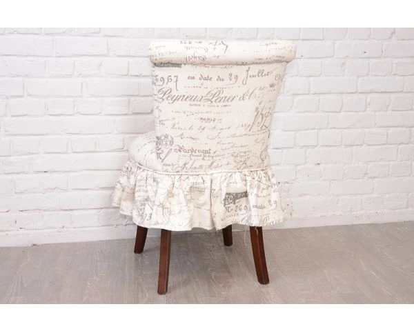 Très jolie chaise en chêne massif avec l’assise et le dossier en tissu avec un motif écriture.