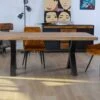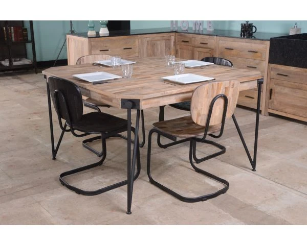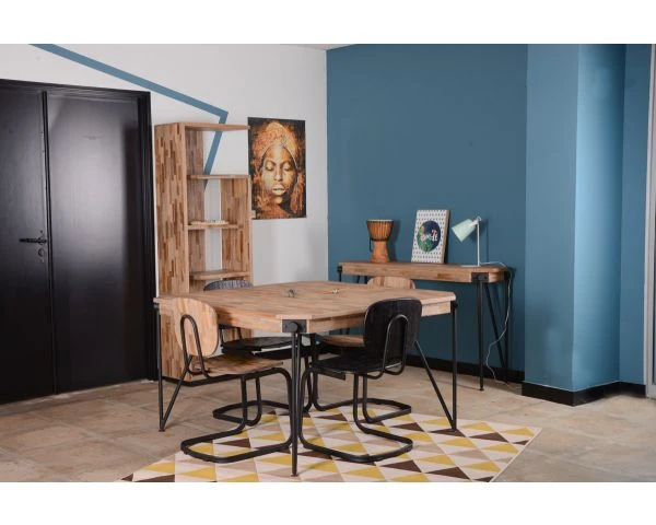 Cette chaise en bois massif naturel teinté a été réalisée avec différents morceaux de bois massifs exotiques tels que le manguier, le palissandre et l’acacia.