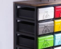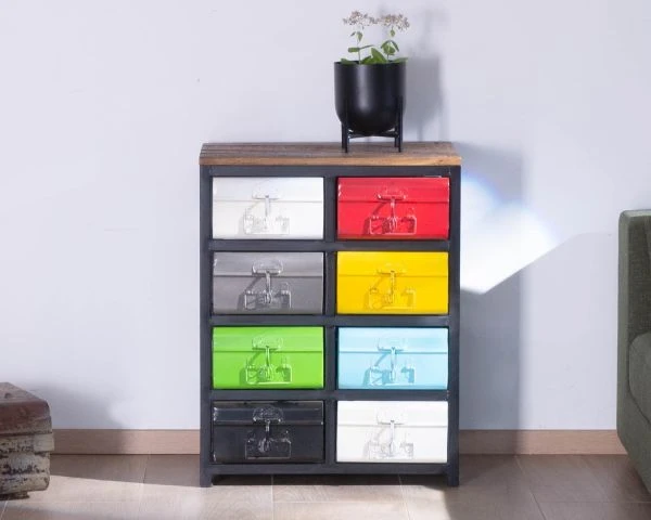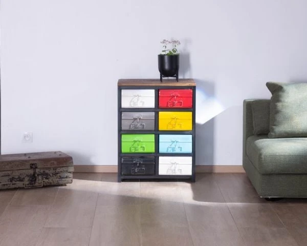 Avec ses 8 tiroirs de couleur, votre meuble de rangement apporte de la personnalité et du fun à votre intérieur. Son allure industrielle et sa fabrication artisanale se marieront parfaitement à un univers vintage ou de style méli-mélo.