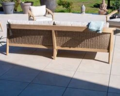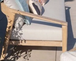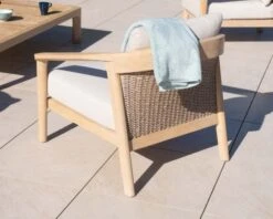 Matières : Structure teck massif, tressage textilène aspect rotin, tissu spécial extérieur écru, mousse QuickDry®