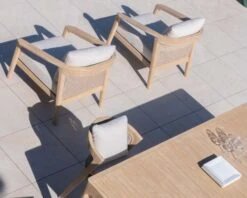 Le bois de teck est une essence naturellement résistante à l’eau et imputrescible. Au fil des saisons et avec l’exposition au soleil et aux intempéries, le teck peut se teinter de nuances grisées. Afin de préserver l’éclat initial du teck et le protéger d’éventuelles traces d’eau vous pouvez huiler le bois de manière ponctuelle, une à deux fois par an selon l’usage et l’exposition.