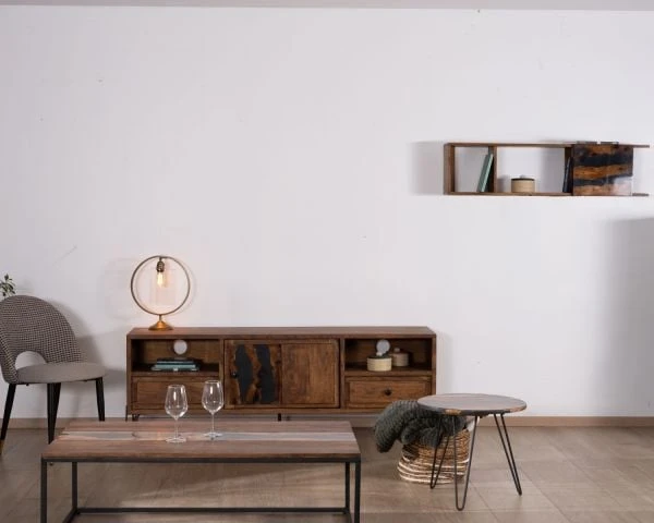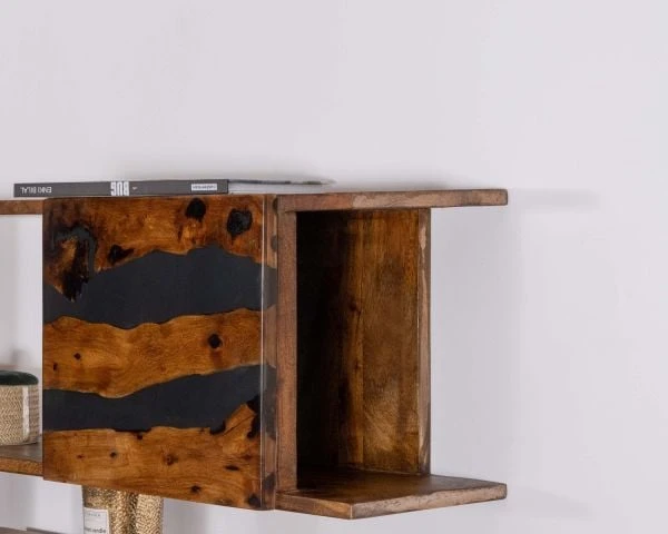 Incrustée de résine gris foncé, la façade fixe de la niche de cette étagère murale en acacia massif se trouve parée d’un cachet authentique, l’ensemble semblant façonné par la main de la nature elle-même et porteur d’une histoire immortalisée par le temps. La finition brillante du bois et de la résine donne le loisir à la lumière de se refléter pour faire ressortir de manière plus ou moins prononcée la profondeur du gris.