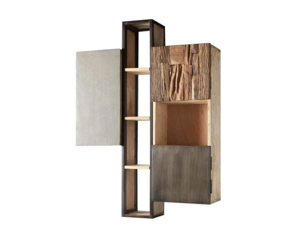 Bois massif de manguier, bois recyclé, ciment texturé granuleux, métal patiné