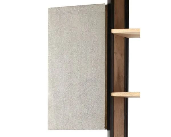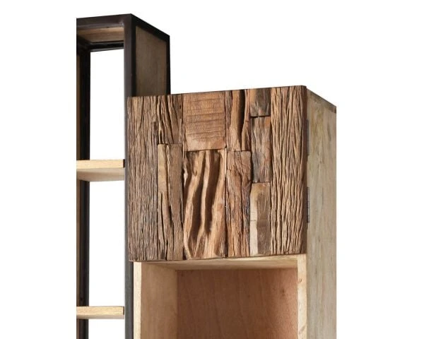 Conçue avec différents matériaux robustes, l’étagère avec caisson bois « Mezzo » est atypique et singulière. On craque pour ses 3 portes aux façades couvertes d’un béton texturé, d’une feuille de métal et de morceaux de bois exotiques recyclés donc toujours différents. Les contours du caisson central en manguier massif sont traités de manière brute, le travail de soudure est volontairement laissé apparent pour apporter encore plus de caractère à l’ensemble du meuble d’appoint.