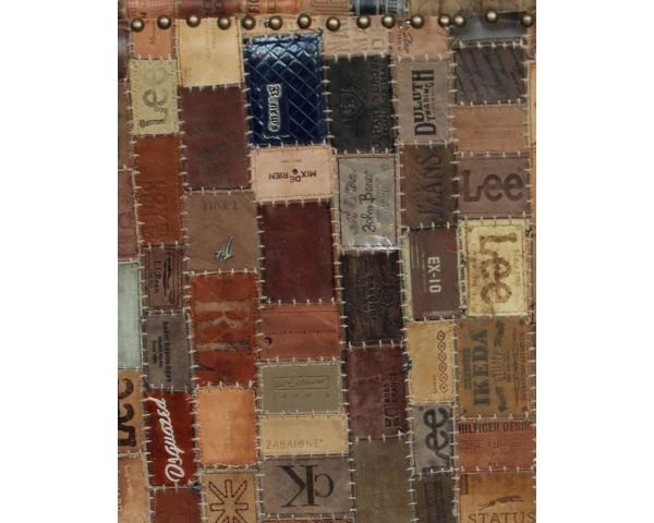 Étiquettes de jeans recyclées, rembourrage, bois de manguier massif
