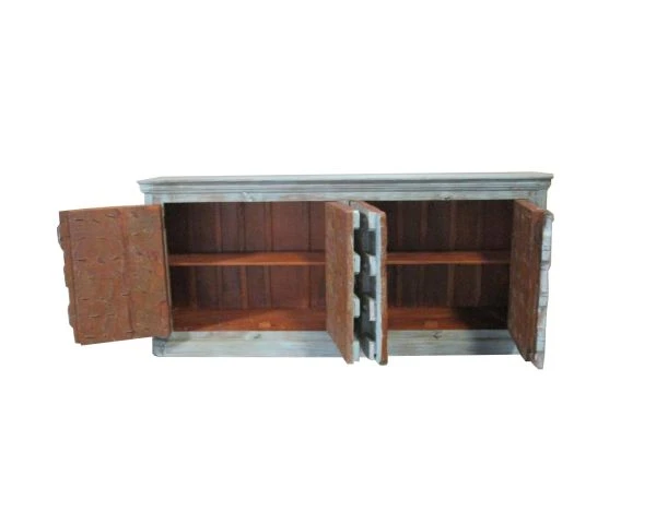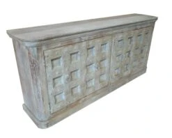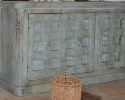 Ce grand buffet de style indien possède tous les atouts pour vous plaire : du bois massif, de belles dimensions et une histoire unique comme tous les meubles de notre collection « Vieille Porte ». En effet, il a été confectionné en Inde par des artisans locaux. Recyclant de vieilles portes provenant des maisons abandonnées de Jodhpur, ils ont réalisé ce meuble à la main. La structure du buffet a été conçue autour des façades issues de portes, puis l’ensemble a été patiné manuellement. Les teintes sont caractéristiques de Jodhpur que l’on surnomme « la ville bleue ». Ce buffet indien est une pièce unique de manufacture artisanale : nulle part ailleurs vous ne retrouverez un meuble identique !