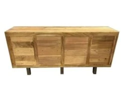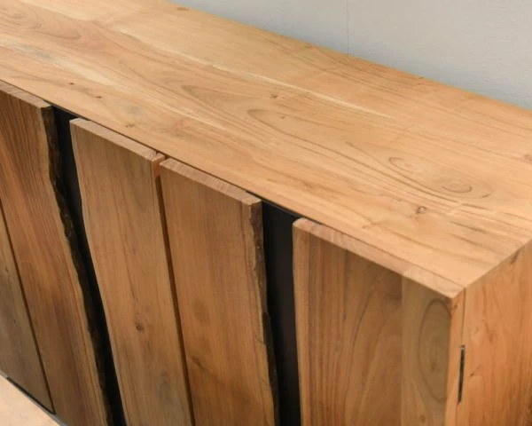 Comportant quatre portes, ce buffet bas est conçu en acacia massif dans une finition à la chaleureuse nuance de teck naturel. Il porte le charme distinctif du bois brut avec son veinage apparent et ses façades de portes aux galbes naturels qui reprennent la forme authentique des troncs d’arbre.