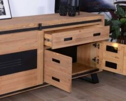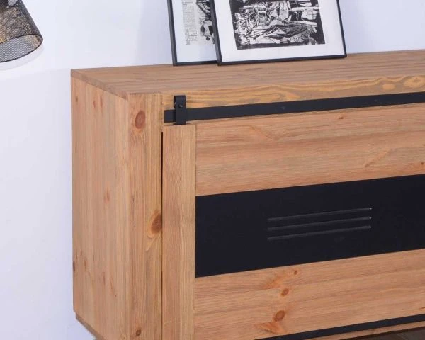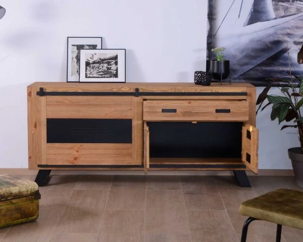 Entre ses dimensions de 48 x 85 x 190 cm (P x H x L) et ses nombreux modules de rangement, votre nouvelle enfilade en bois vous permet de libérer votre espace. A vous la zénitude ! Votre cuisine ou votre séjour sont rangés avec soin. Dans son tiroir, votre meuble de rangement accueillera dossiers administratifs ou couverts. Derrière ses deux portes battantes, votre vaisselle attendra sagement le prochain dîner… Jeux de société, livres et autres babioles se dissimuleront derrière la porte coulissante. Cadres et vases seront posés avec élégance sur le long plateau tandis qu’une grande horloge ou un tableau pourront être placés juste au-dessus.