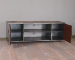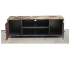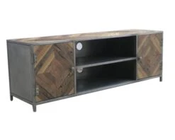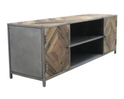 Ce meuble de télévision de grande taille représente l’élément idéal pour donner à votre salon ou votre chambre un côté « style factory » particulièrement coquet. Le plateau et les portes sont recouverts de lattes de bois recyclé dans une optique écologique, qui se marie parfaitement avec la structure en métal pour un assemblage unique en son genre. Grâce à son association très sobre de brun et de gris, ce produit saura aisément se combiner avec de nombreuses couleurs de décorations différentes, ainsi qu’à des styles d’intérieurs variés : contemporain, scandinave, moderne ou rustique. Ce meuble s’adaptera sans problème à votre créativité et votre imagination débordante !