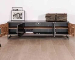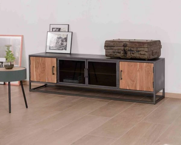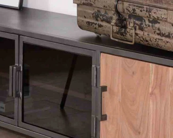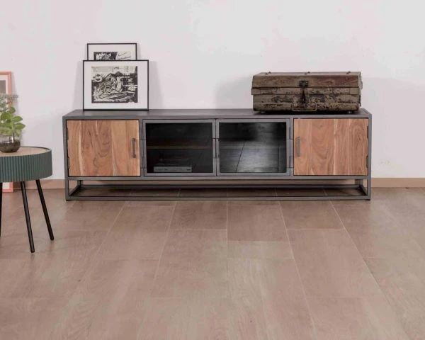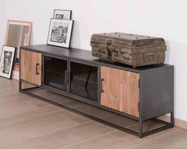 Avec une longueur de 180 cm, votre nouveau meuble bois et métal permet d’installer un écran généreux sur son caisson supérieur. Vous pourrez aussi disposer quelques petits objets déco et des bougies pour créer une déco qui ne ressemble qu’à vous. La longueur généreuse de ce mobilier est très appréciable mais cependant votre mobilier ne prendra pas trop de place car sa profondeur de 40 cm n’est pas imposante. Pour réussir à coup sûr votre aménagement et avant de commander du mobilier, n’hésitez pas à simuler au sol l’encombrement de chaque élément avec du scotch de peintre ou du masking tape. Si vous gardez votre table basse et vos fauteuils, vous vous rendrez compte des volumes et vous pourrez appréciez la place qu’il vous reste pour circuler dans votre pièce de vie. Livré déjà assemblé, votre meuble TV factory trouvera pour le coup rapidement sa place et vous en profiterez immédiatement. De quoi prévoir une soirée cinéma à la maison en toute tranquillité…