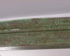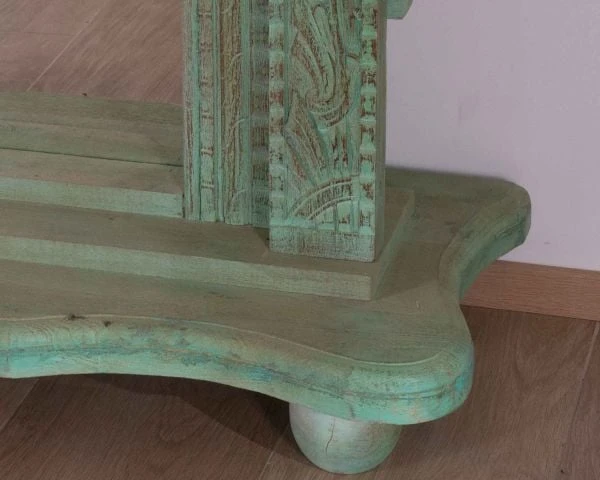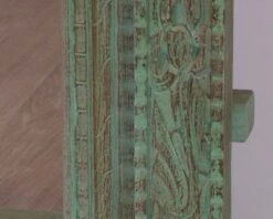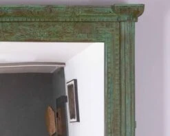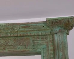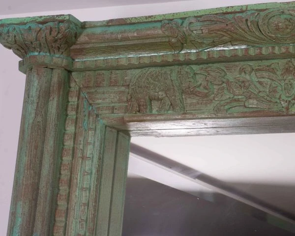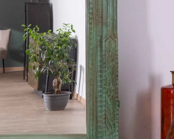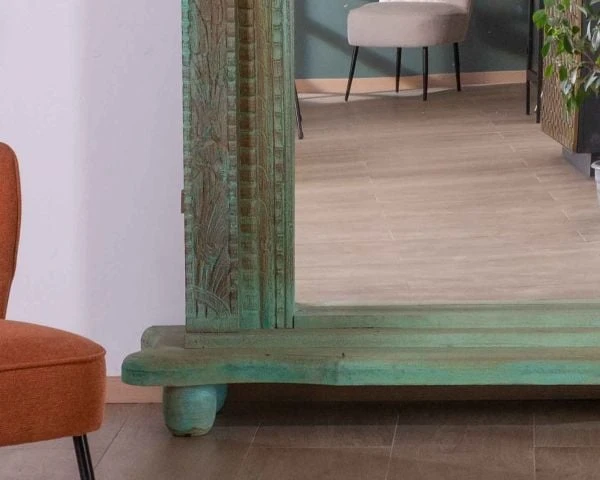 Ce psyché indien est un modèle unique qui magnifiera à coup sûr votre hall d’entrée, votre séjour ou votre chambre. Dans la réception de votre maison d’hôtes ou à proximité des sanitaires de votre resto indien, ce grand miroir de L.177 x P.51 x H.228 cm fera sensation auprès de vos clients. Chacun prendra plaisir à s’admirer devant ce miroir XXL encadré de dessins gravés inspirés de la faune et de flore indoues. Le bois teinté dans une remarquable couleur verte permettra d’apporter encore plus d’originalité à ce miroir en bois exotique recyclé tout en laissant apparaitre les teintes naturel de la matière. Le socle de base, avec ses pieds boules parfaitement d’aplomb, permettra de stabiliser le poids global du meuble.
