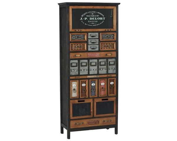Le plateau et les pieds sont en sapin massif de couleur noire. Elle est composée de 21 tiroirs de rangement. C’est un meuble ultra décoratif avec les patchworks de couleurs, les motif, les matières. Les poignées sont en métal de formes et de couleurs différentes pour donner le style industriel recherché.