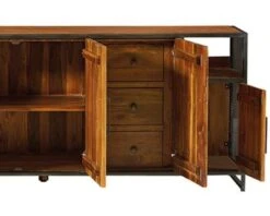 Ses lignes épurées, contemporaines et nettes s’accorderont à merveille à une déco de style classique en apportant un côté chaleureux mais aussi à une décoration industrielle qui conjugue avec brio ce genre de matières. Ce long buffet bas est soutenu par une structure en fer vieilli et brute pour donner plus d’authenticité et de cachet au meuble. Les poignées et les grilles perforées terminent d’apporter de la qualité et des finitions exceptionnelles à ce bahut. Le reste du meuble est en teck massif naturel recyclé. De par cette essence de bois upcyclée, vous pourrez être certain(e) d’avoir un meuble singulier et qui aura participé à la préservation des ressources. Revalorisé, le bois garde son vécu et on peut y retrouver les traces du temps ou les imperfections naturelles de la matière qui continueront à vivre leur histoire dans votre intérieur.