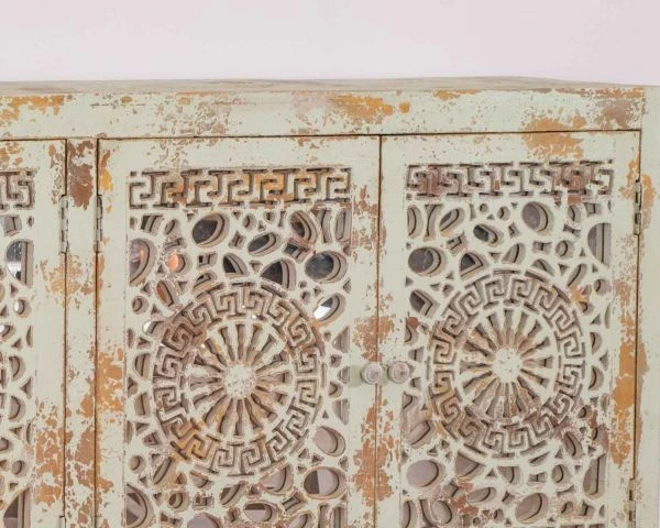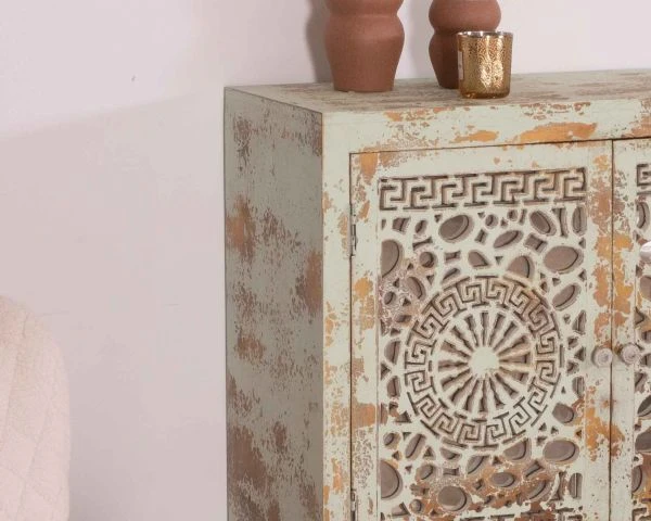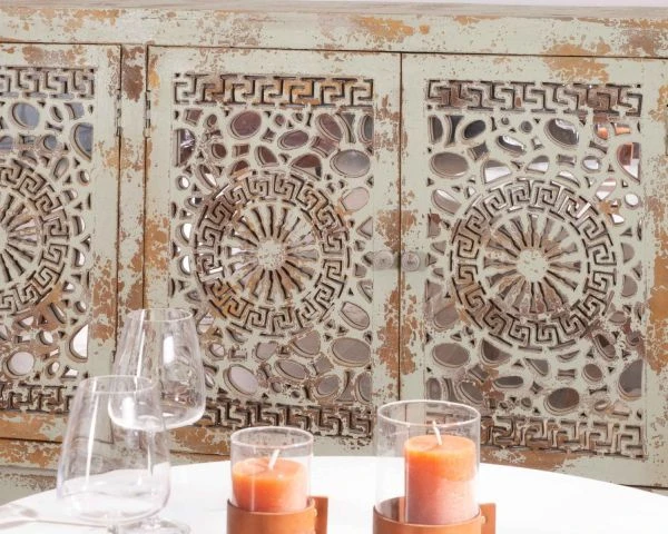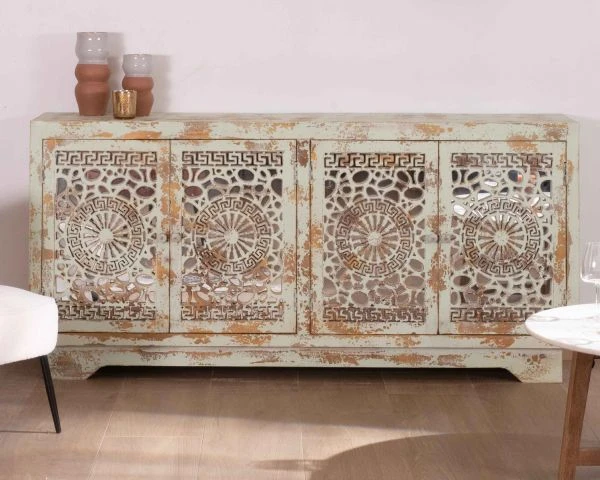 Avec ses 4 portes ouvragées avec soin et percées en façade par de superbes mandalas, cette enfilade en bois massif ne manquera pas d’apporter sa zénitude à votre salle à manger. Conçue entièrement à la main par des artisans passionnées par le mobilier de charme, ce grand bahut en bois exotique coloré présente une teinte douce faussement vieillie pour encore plus de personnalité. On craque pour son design ethnique et ses finitions bourrées de charme. Et c’est sans parler de l’application de miroirs derrière les découpes qui reflètent la lumière. Juste magnifique ! Avec son coloris clair, ce meuble peut facilement trouvé sa place dans un intérieur délicat au parquet bois et décoré par des paniers en fibres naturelles, des tapis blancs en fausse fourrure, des chaises bistrot chinées…
