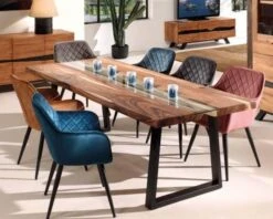 La plaque en verre trempé qui traverse toute la longueur de la table donne une note raffinée à la composition du meuble et met en valeur le dessin du bois qui apparait par transparence. Ainsi, l’habile jeu des matériaux fait de votre table à manger une pièce rare et unique. Mêlant la modernité du verre et du métal et le naturel du bois exotique, votre table se veut aussi très solide et pérenne.