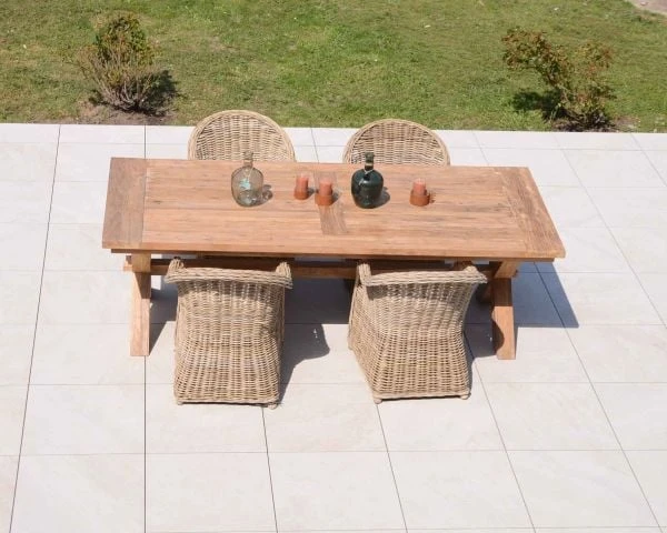 Sous l’action du soleil et au fil du temps, votre mobilier en teck pourra vraisemblablement prendre des reflets subtilement grisés et ce de façon totalement naturelle. Votre table de jardin n’en restera pas moins bourrée de charme et parfaitement usuelle. Fabriquée de manière artisanale et avec le plus grand soin par des menuisiers indonésiens, votre grande table en bois préserve les ressources naturelles en utilisant une matière exotique recyclée et chaque pièce sera de ce fait unique. En choisissant cette table à dîner robuste et pérenne, vous faites aujourd’hui un achat responsable et durable.