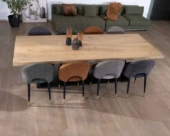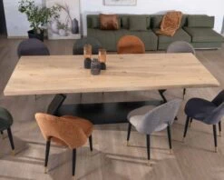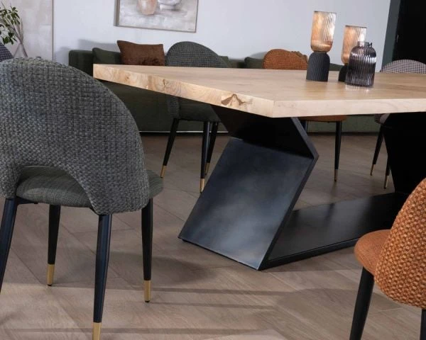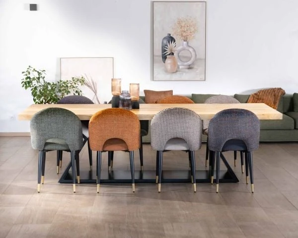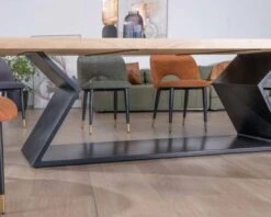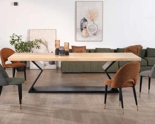 Pour parfaire l’aménagement de votre pièce de réception, entourez votre fastueuse et audacieuse table de repas en acacia et pied sablier en métal de chaises au design fluide et léger qui laisseront l’espace aéré. Misez sur une décoration épurée qui jouera sur les couleurs et les matières visuellement dynamique pour faire de votre salle à manger un lieu convivial et sophistiqué.