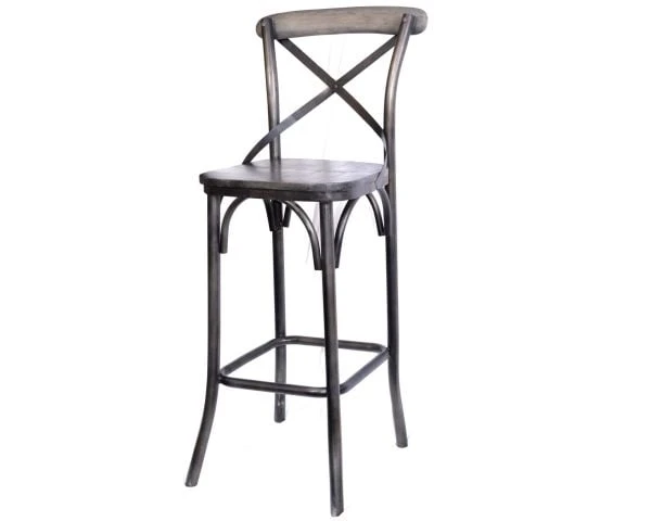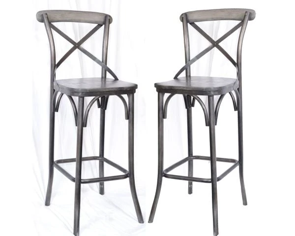 Le métal est gris très foncé quasiment noir et le bois, du manguier massif est également grisé. La finition récup, sciée et brossée apporte du caractère à ces tabourets.