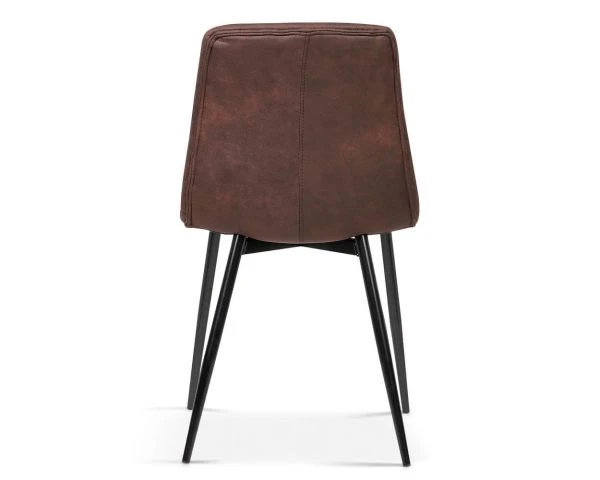 Les pieds en métal noir, droits et légèrement effilés, créent un fin contraste avec l’assise joliment galbée. Le revêtement en tissu microfibre marron, évoque avec discrétion le cuir bruni d’un ancien fauteuil club. L’allusion n’est pas vaine, car le confort de cette chaise matelassée constitue l’un de ses points forts : la microfibre, remarquable pour sa solidité et sa tenue, offre au toucher un contact doux et agréable, relayé en profondeur par le confort douillet de l’assise matelassée, fermement assurée par le solide piétement métallique.