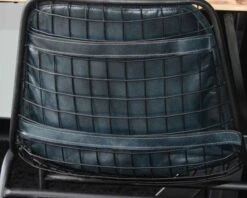 Elle se compose d’une galette de cuir vieillie délibérément pour plus de cachet d’une part et d’une structure en fer quadrillé d’autre part. La galette de cuir est dissociée de la structure et vient s’y fixer par l’intermédiaire de sangles en cuir passant par l’arrière du meuble.