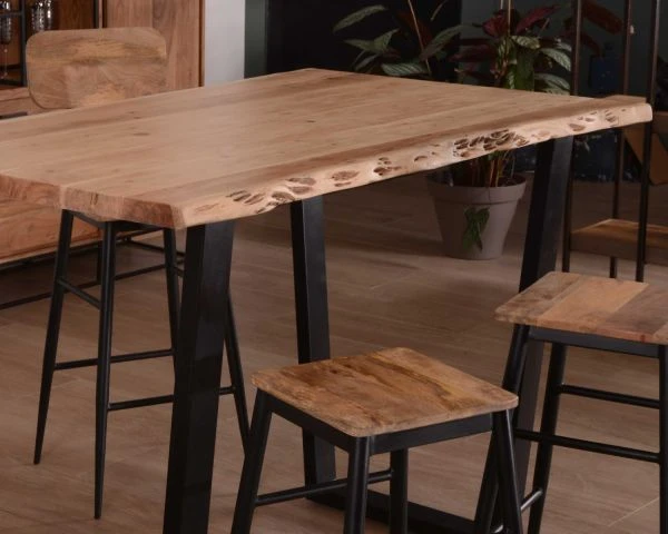 Particulièrement esthétique, la table haute de 120 cm de long « Jaffna » vous permettra de profiter de p’tits déjs, repas et brunchs informels mais toujours ultra stylés. Quel bonheur de profiter d’un meuble bourré de charme et authentique ! Si vous avez un petit appartement, ce mange debout à la taille adaptée aura tout d’un grand et vous permettra de profiter de vos amis autour de bons repas. Avec un plateau large de 90 cm, vous aurez assez de place pour dresser la table pour 4 personnes. Les pieds noirs en métal et à la forme trapézoïdale seront l’atout modernité de votre nouveau meuble de réception en cuisine tandis que les bords naturels de la table apporteront un côté chaleureux et convivial.