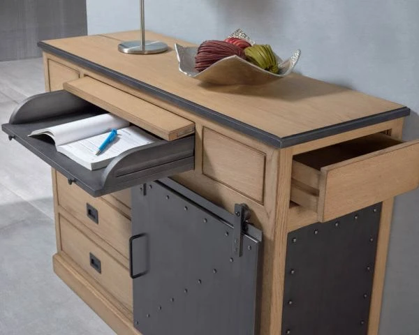 Matières : chêne, placage chêne, fer